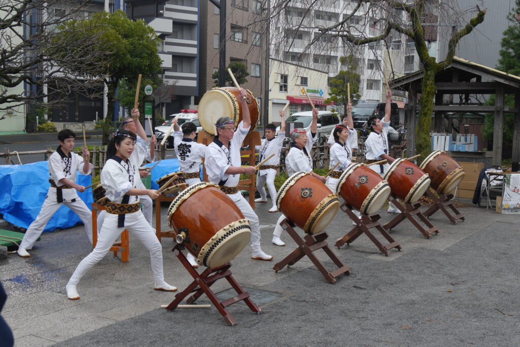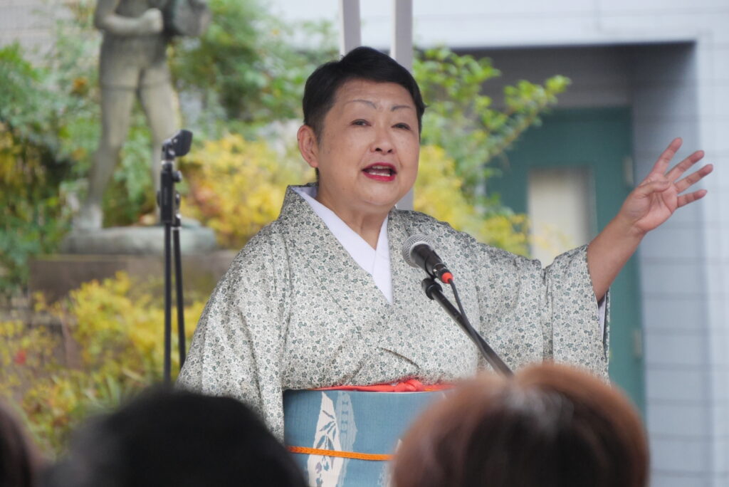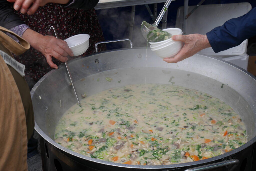 この審査時間、観客に、串カツ、しながわカブが上がるエール、「江戸を食する」品川汁がふるまわれてゆく。巨大鍋に人参、茸、大根、あぶらあげ、品川蕪などが大量に入れられ、江戸時代には擦った大豆が入れられていたとのことだが、現在は豆乳を投入。歌唱コーナーのゲストは、ムード歌謡の名門“ロス・プリモス”にも在籍経験のある徳永淳だ。東日本大震災発生後から自費で約150回、被災地に赴き、支援に取り組んでいる。この日は「ラブユー東京」、「たそがれの銀座」、「桜の花」などを届けた。さらに今年は、品川区社会福祉協議会による「品川社協音頭を踊ろう」コーナーもあった。